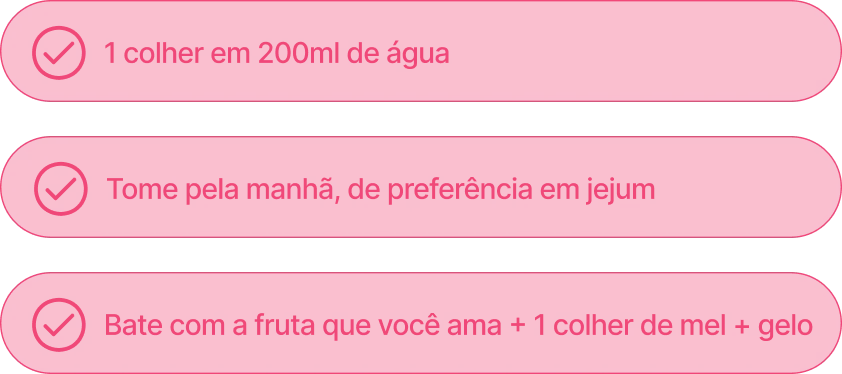 Você toma ele, pela manhã, em jejum de preferência, uma colher para 200 ml de água, coloca sua fruta preferida, uma colher de mel, e se puder colocar gelo melhor, bate tudo no liquidificador, tomar todos os dias. Caso prefira tomar sem nenhuma fruta somente água e o suco, pode tomar também, tipo um shot.